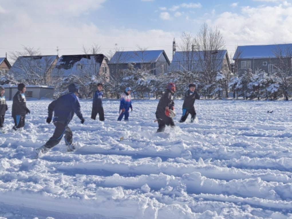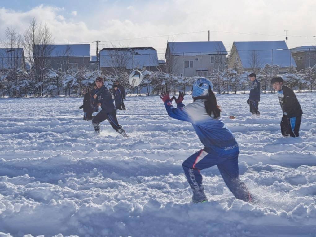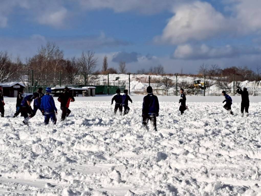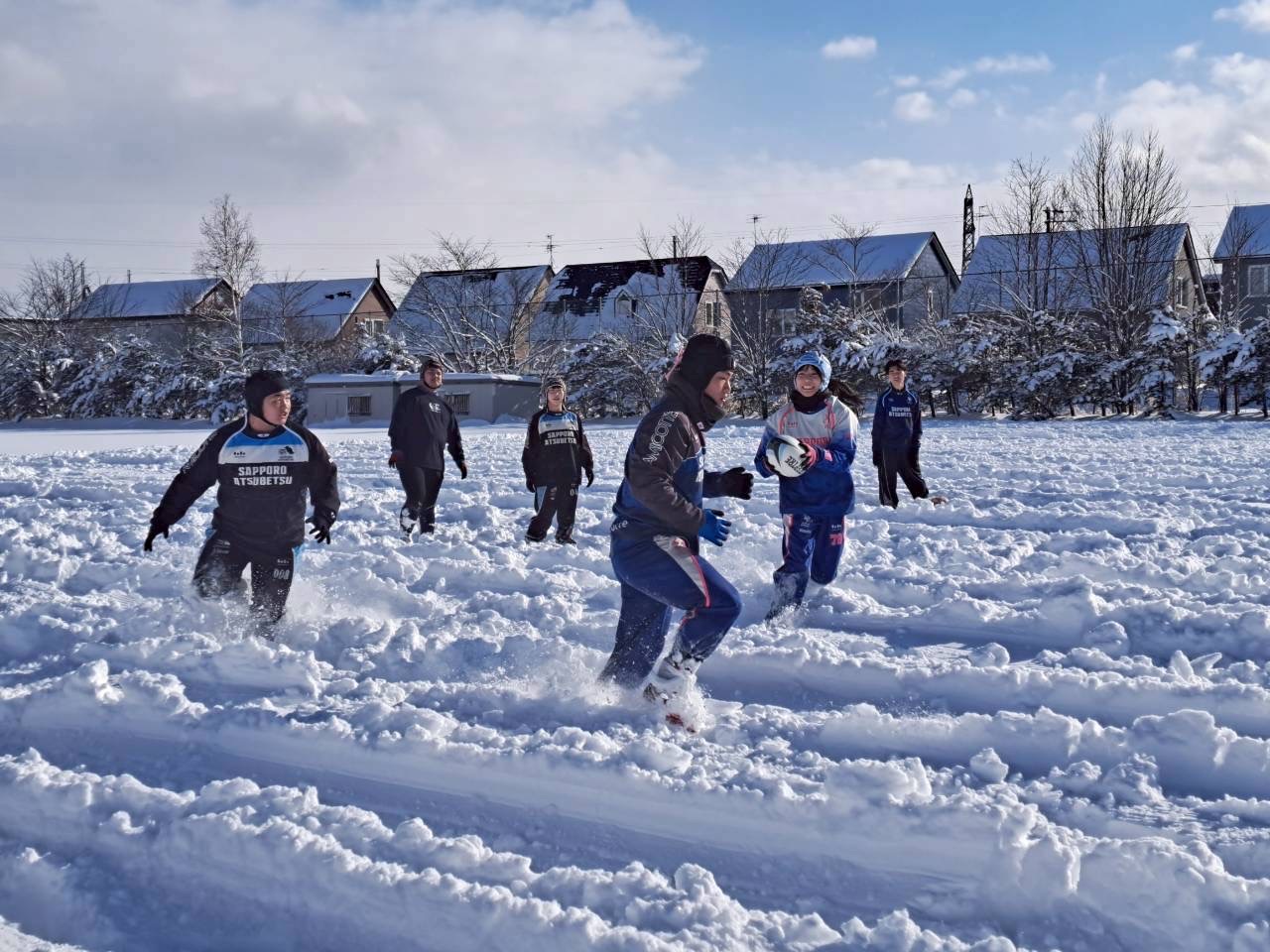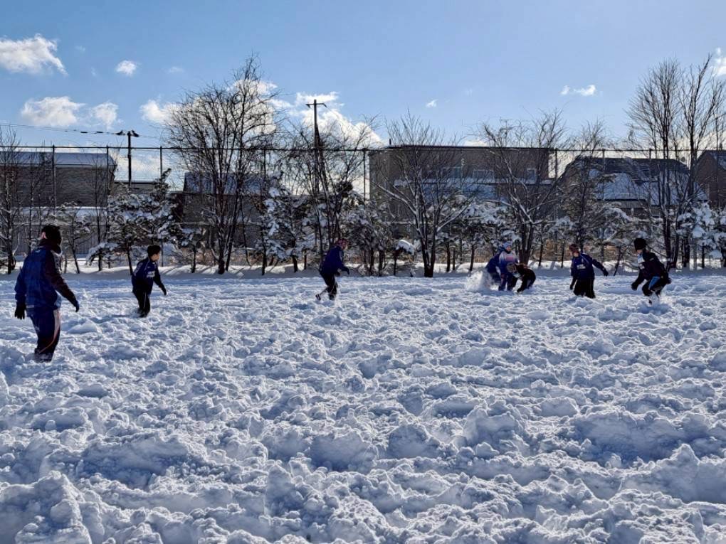 その後、3列パスを行いました。雪でボールが滑ることも頭に入れて、パスする方もキャッチする方も丁寧に行いましょう。