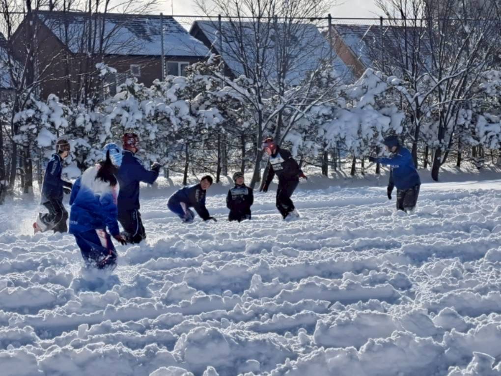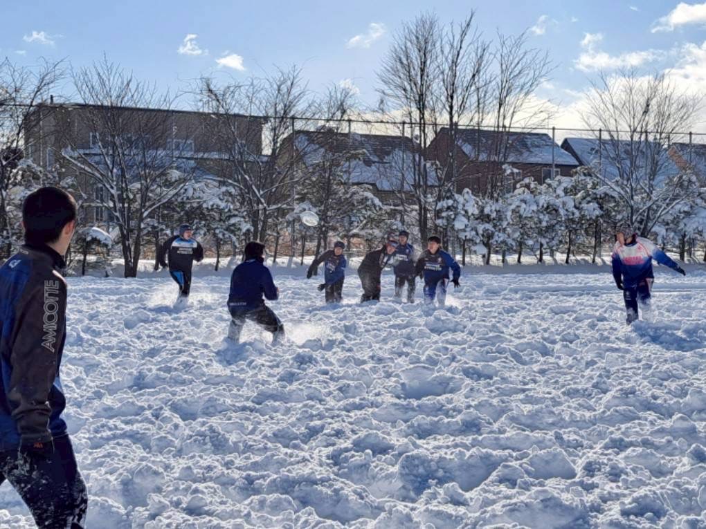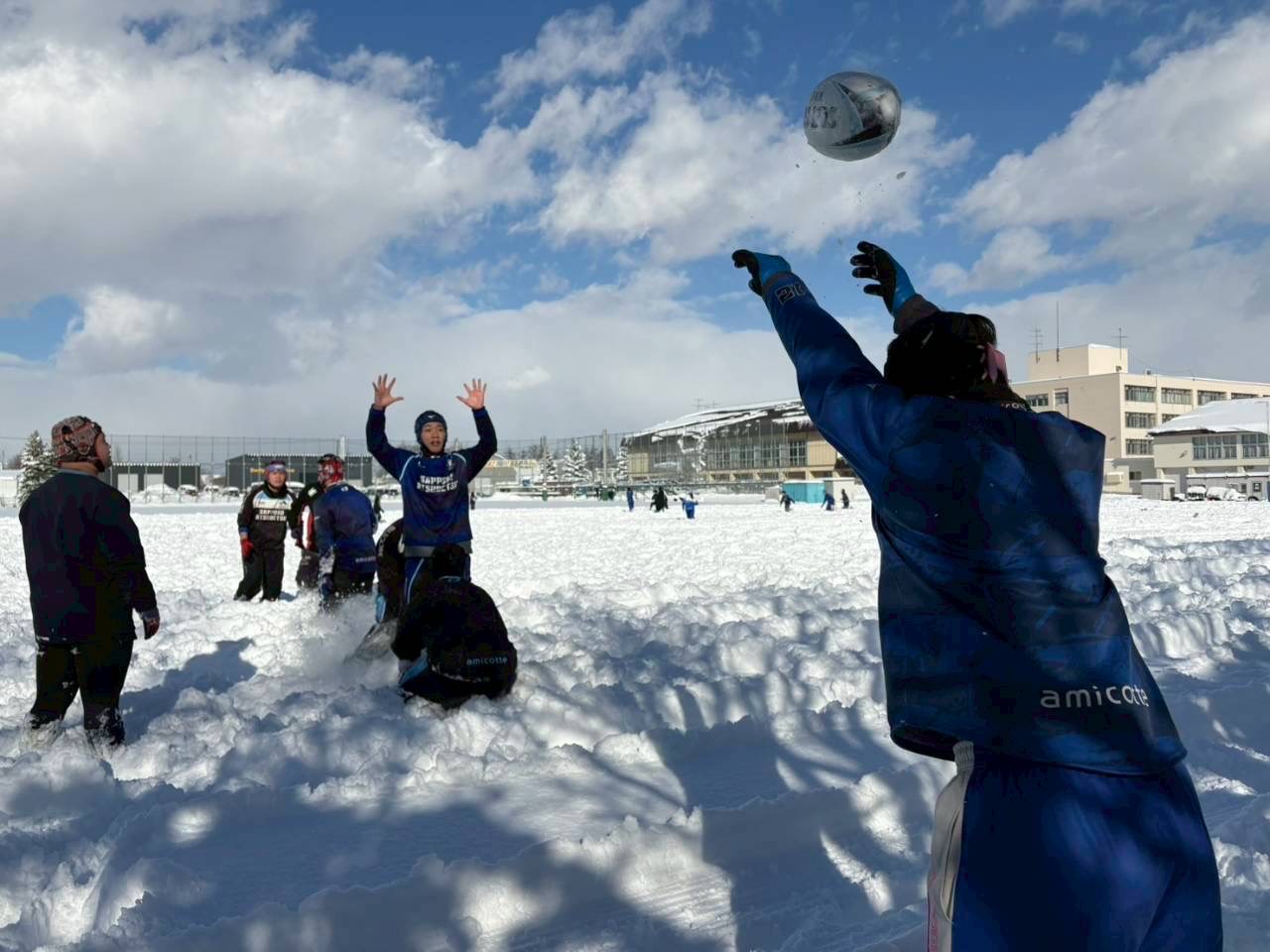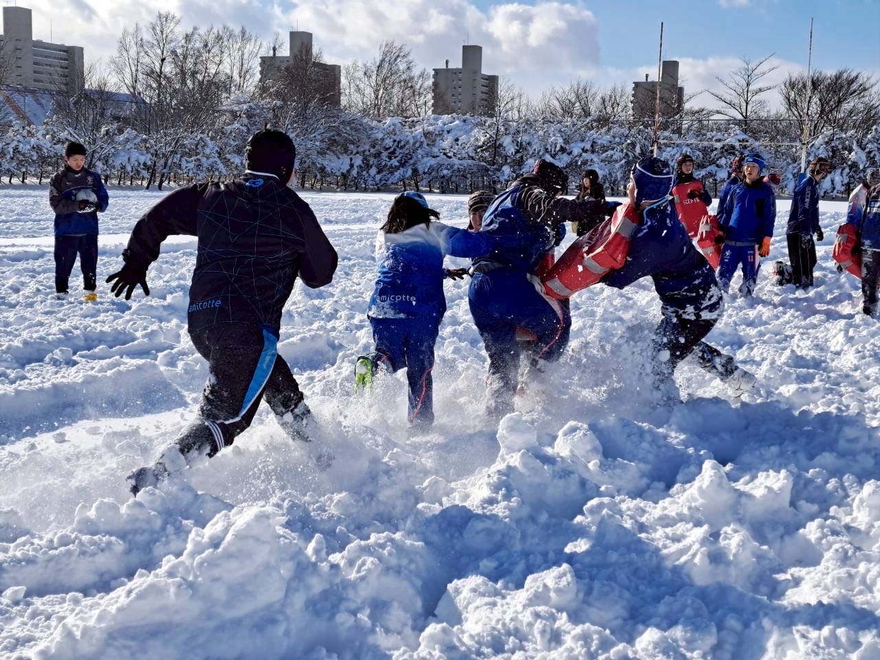 その後、3列パスを行いました。雪でボールが滑ることも頭に入れて、パスする方もキャッチする方も丁寧に行いましょう。