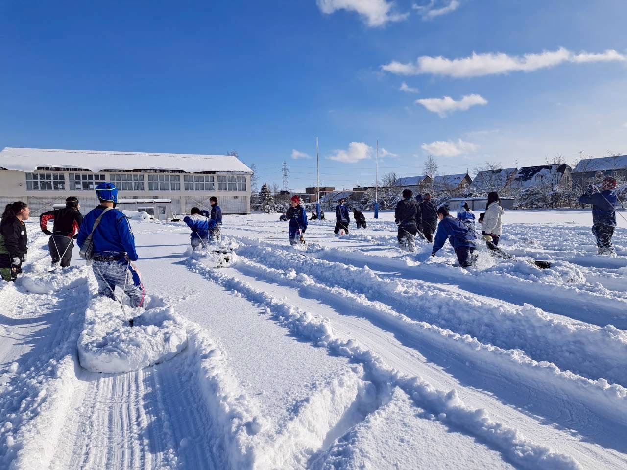 最後にタイヤ引きを再び行いました。雪を平らにならして、明日の試合で動きやすい状態にすることができました。練習終わりで疲れている中、励まし合い頑張っていました。