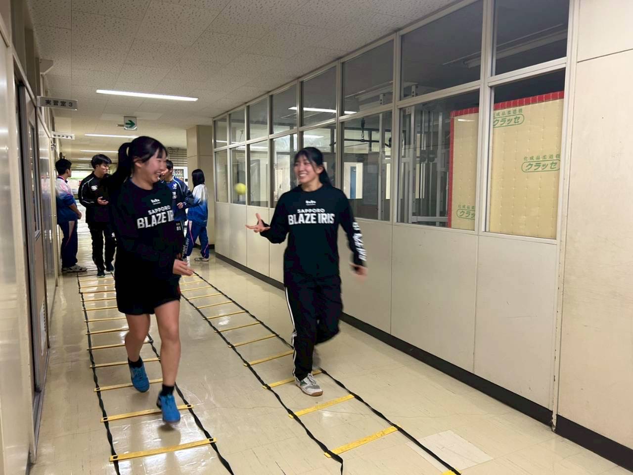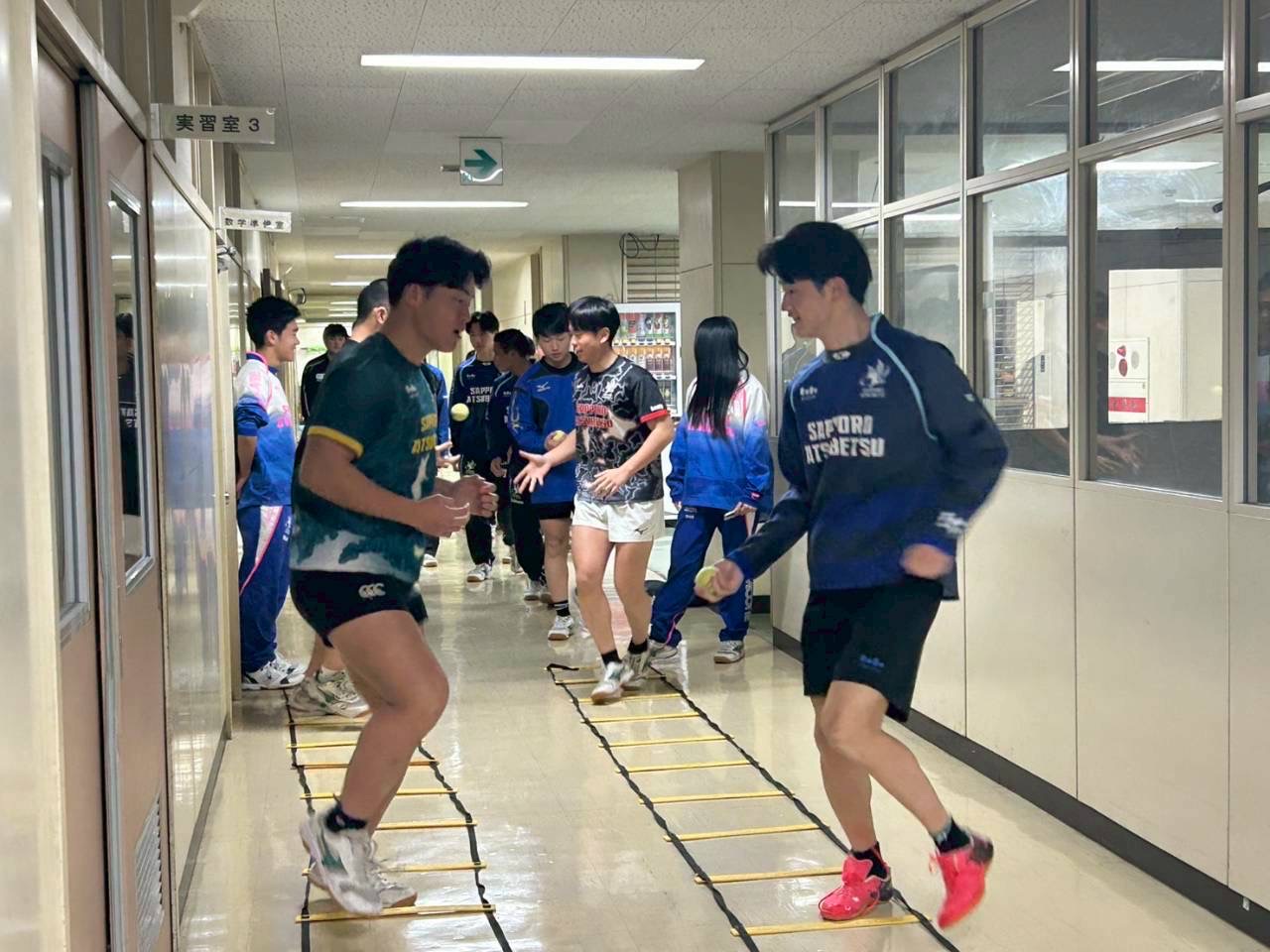 次に、廊下で二重課題のラダーを行いました。細かい足の動きを意識してなるべくラダーに突っかからないようにスムーズに動けるようにしましょう。