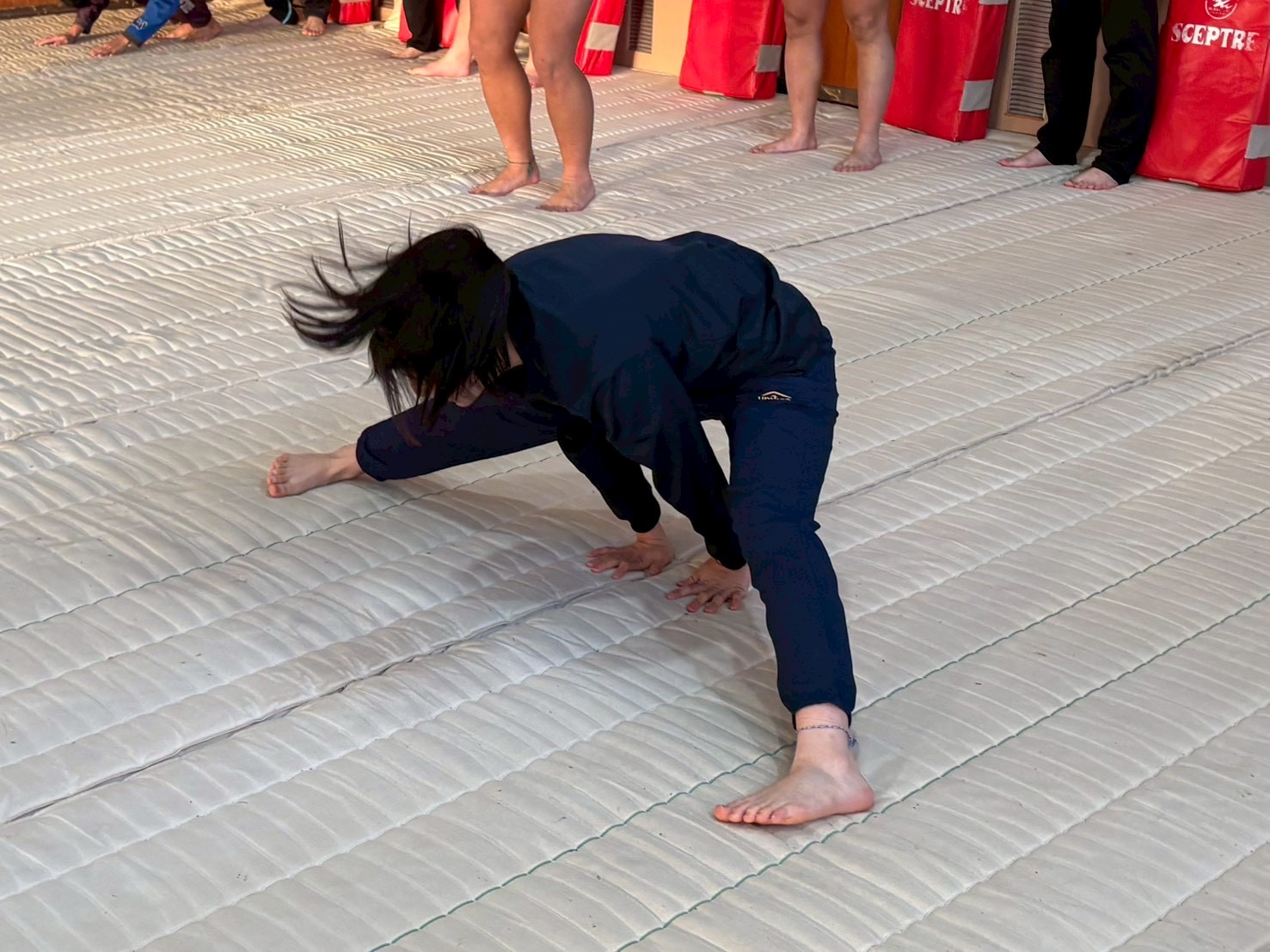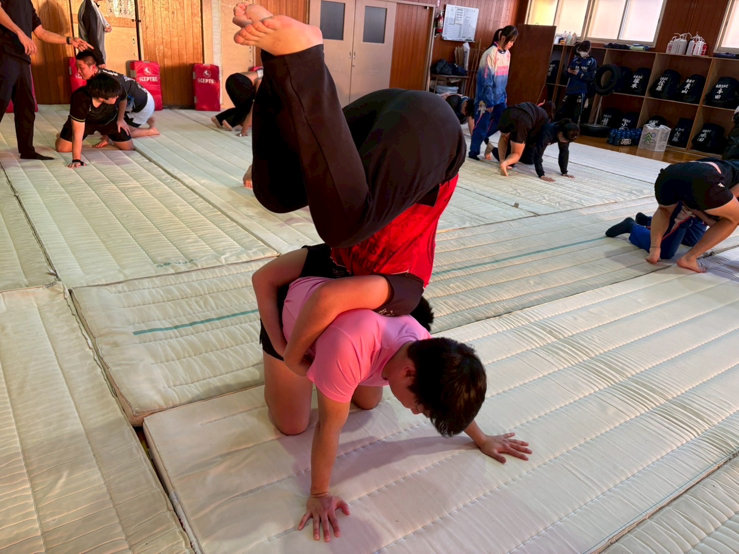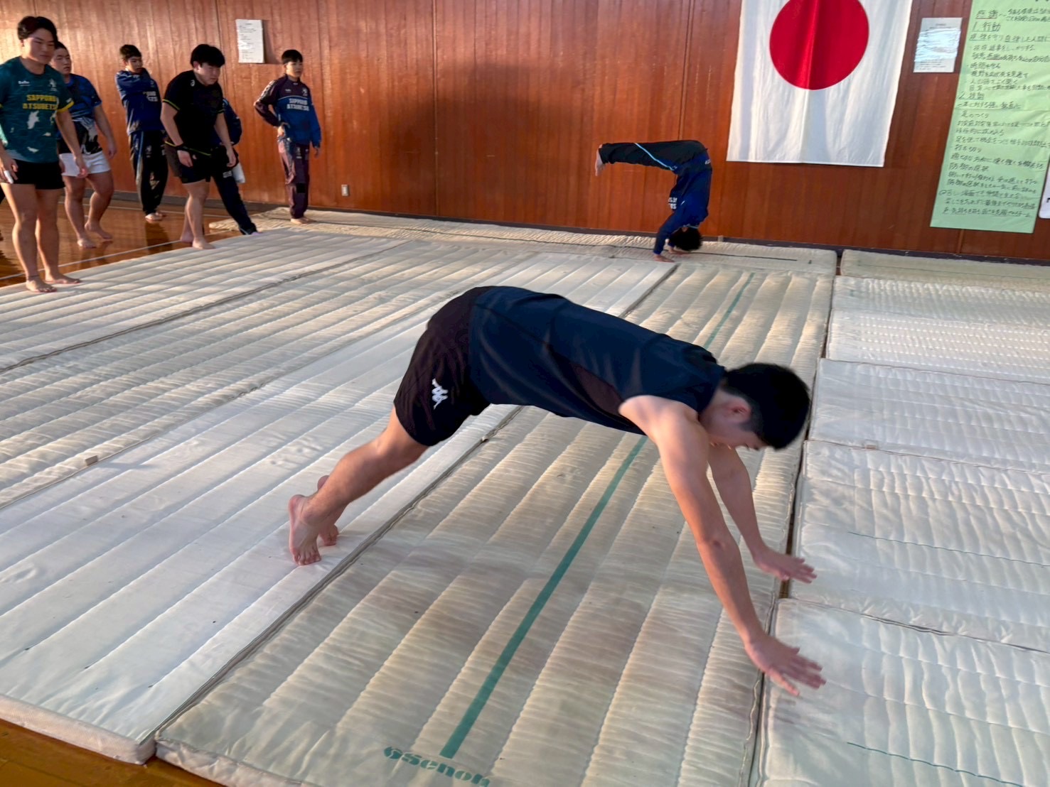 次に三点倒立を行いました。安定している選手もいれば、すぐに崩れてしまう選手がいる様子でした。全員が安定できるようにし、ボディコントロールをしっかりと行っていきましょう。