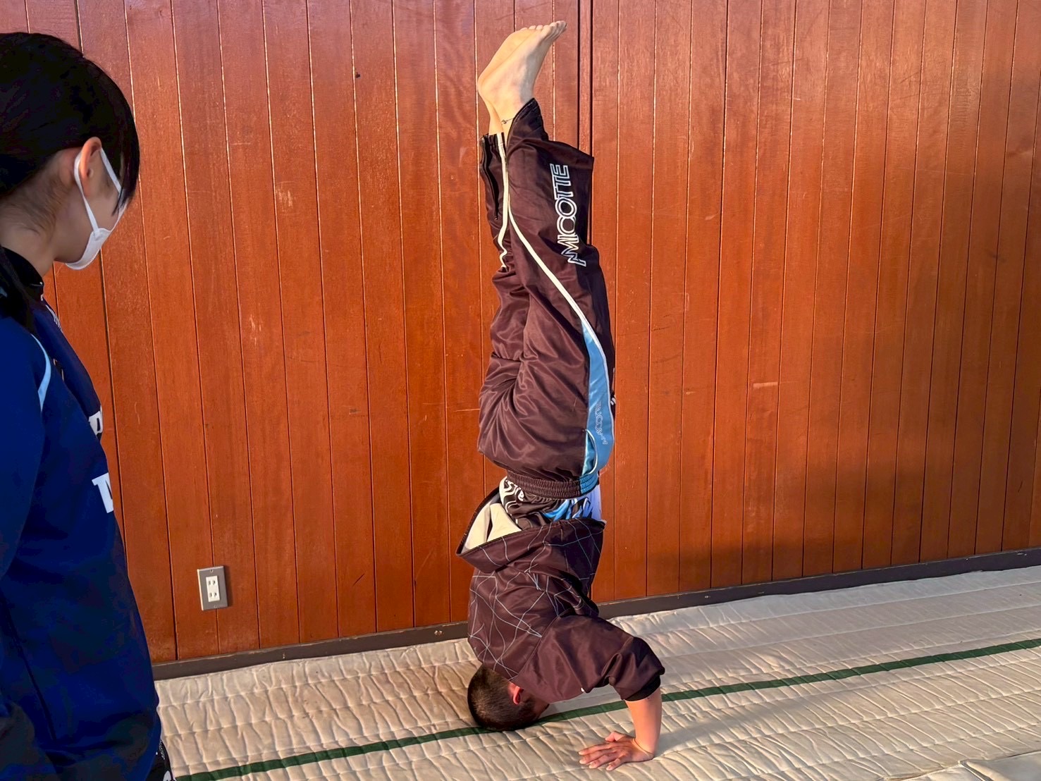 逆立ち腹筋では、前回行った時よりも逆立ちからの腹筋の動作がスムーズにできていました。回数を重ねて補助が無くても自力で取り組めるようにしていきましょう。