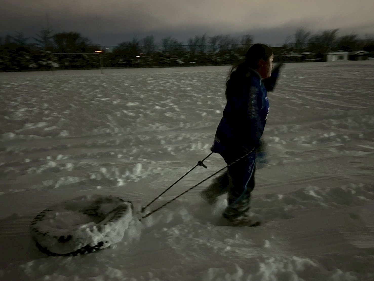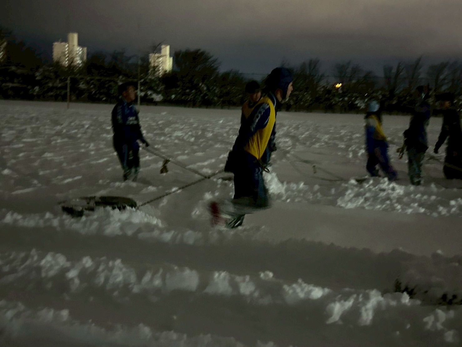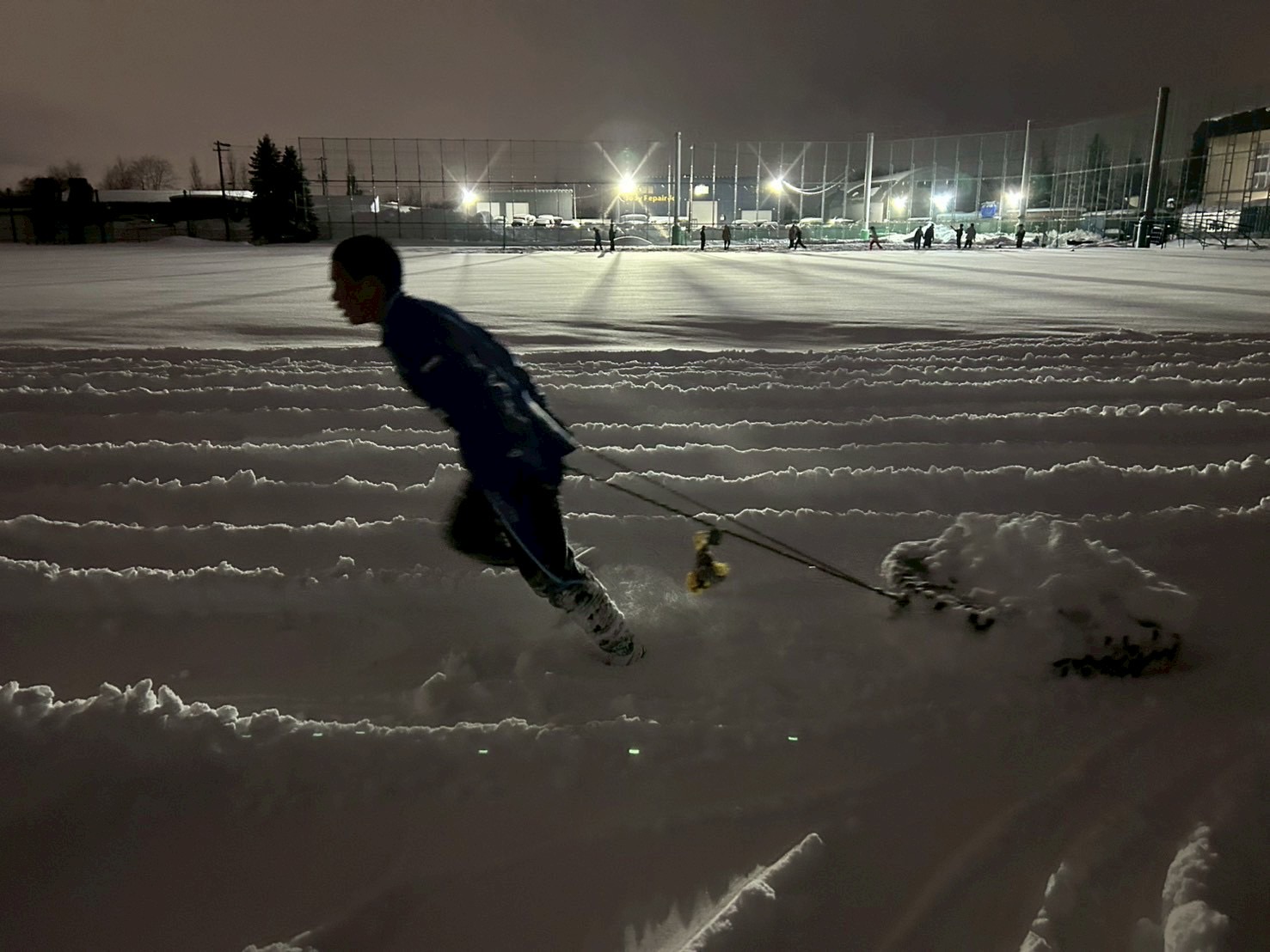 次に、タイヤ引きを行いました。効率化を図るために、一人ひとりが手を抜かずに雪をならせるように頑張りましょう。