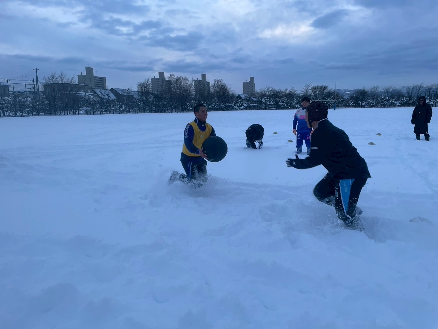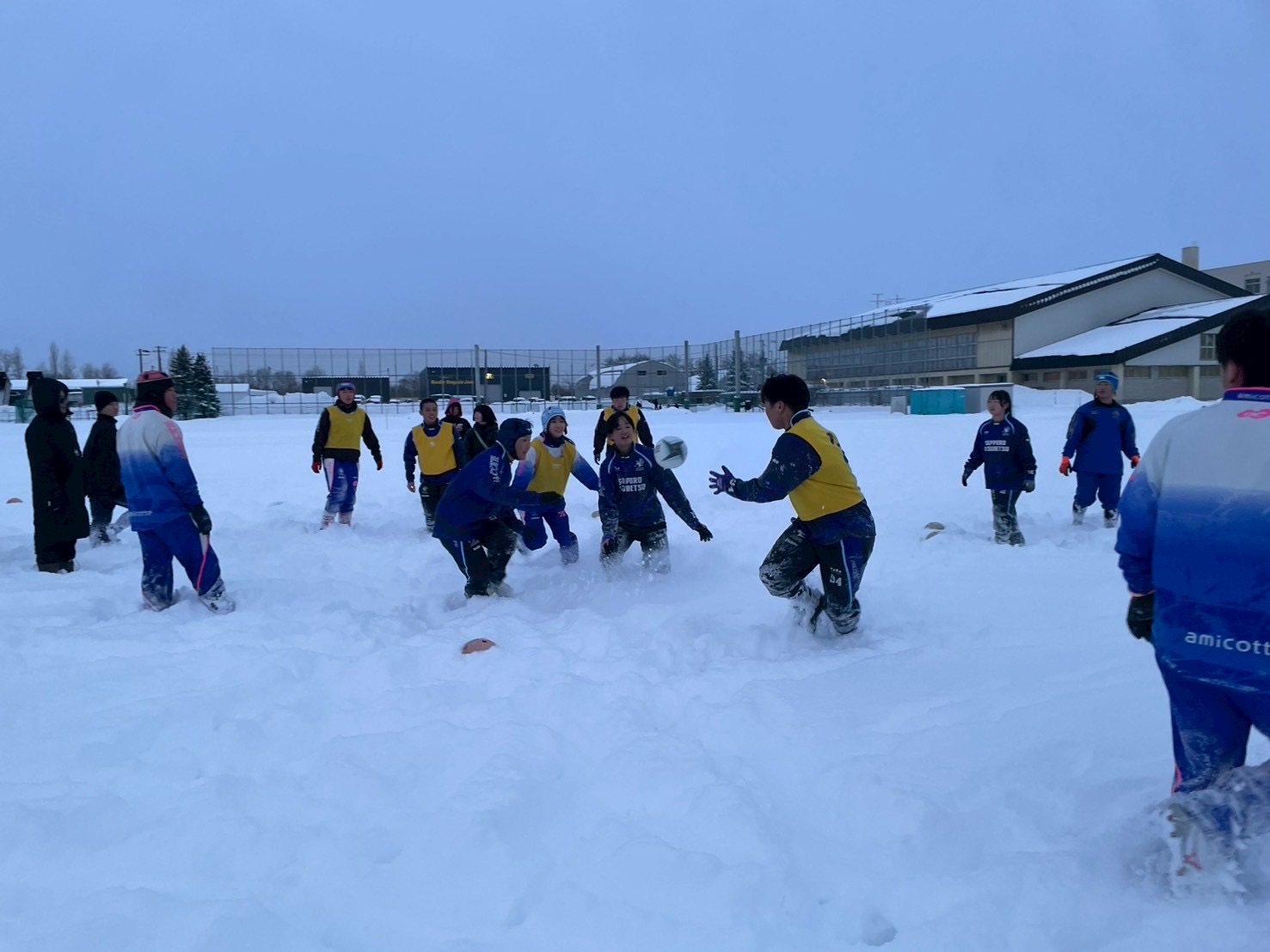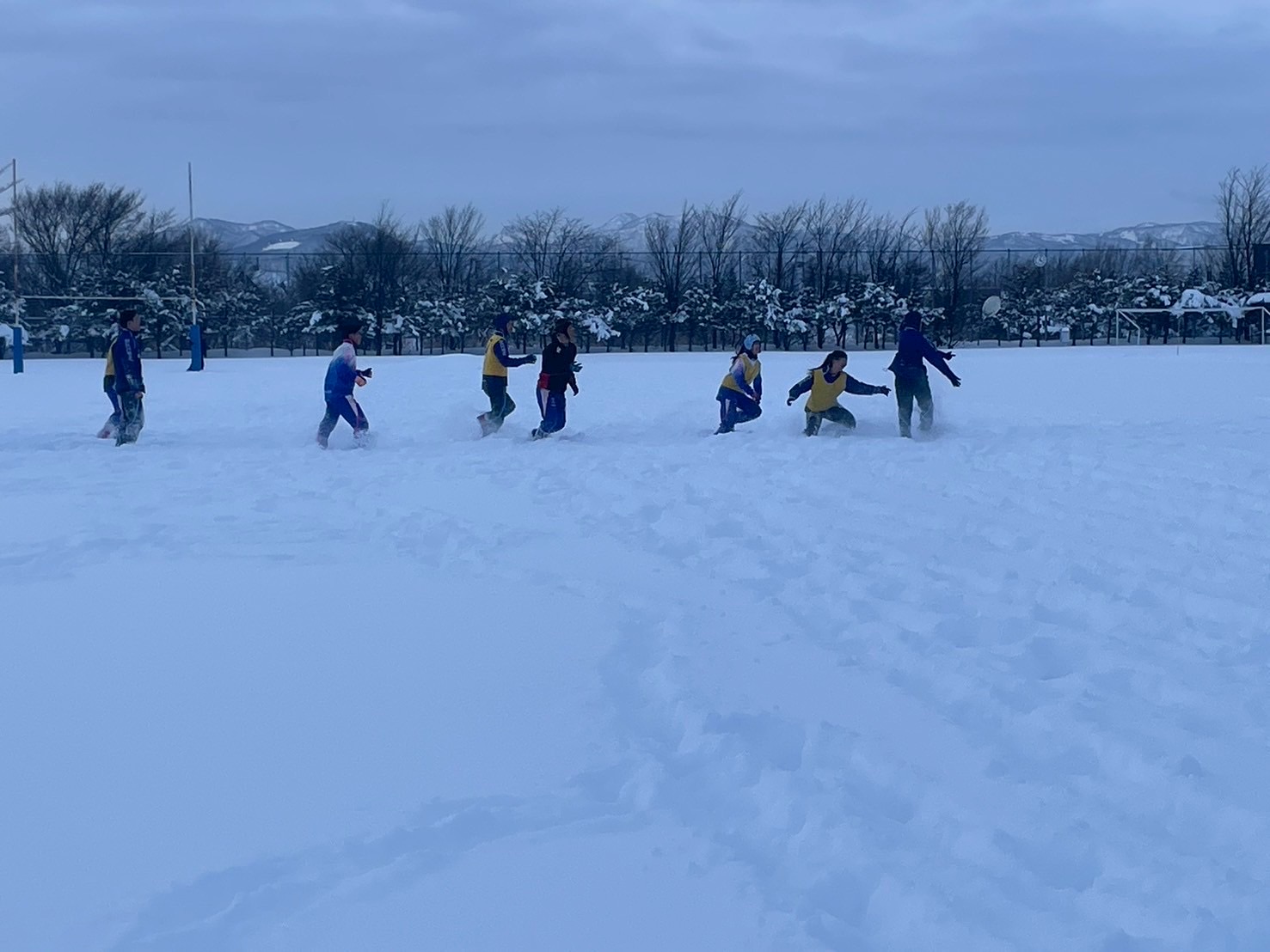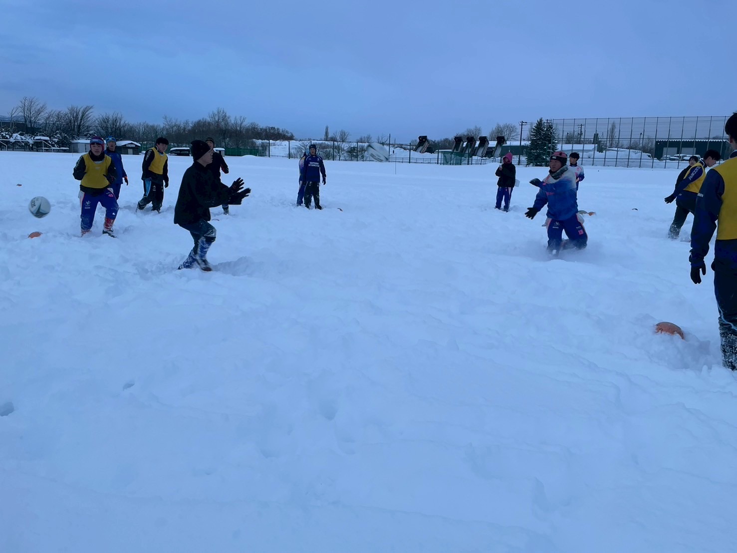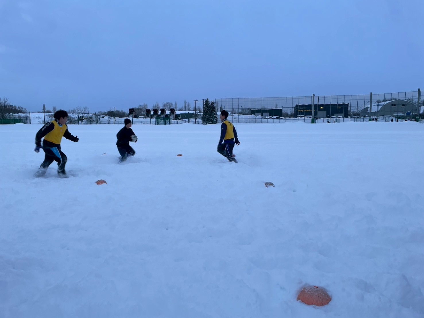 まず始めに、深い雪の中でタッチフットを行いました。ディフェンスに入る際のコミニュケーションをしっかりと取ることや周りの声にしっかりと聞く耳を持つことを意識して頑張りましょう。ゲームをしていない時はアドバイスをしながら大きな声を出す練習を行いました。日頃の練習から大きな声を出し、良い雰囲気作りに努めましょう。