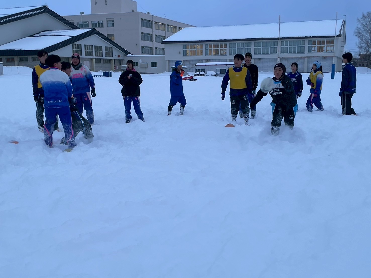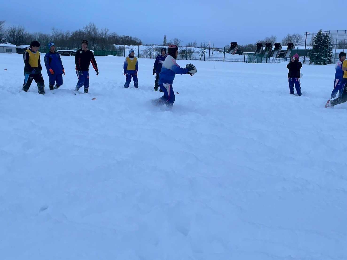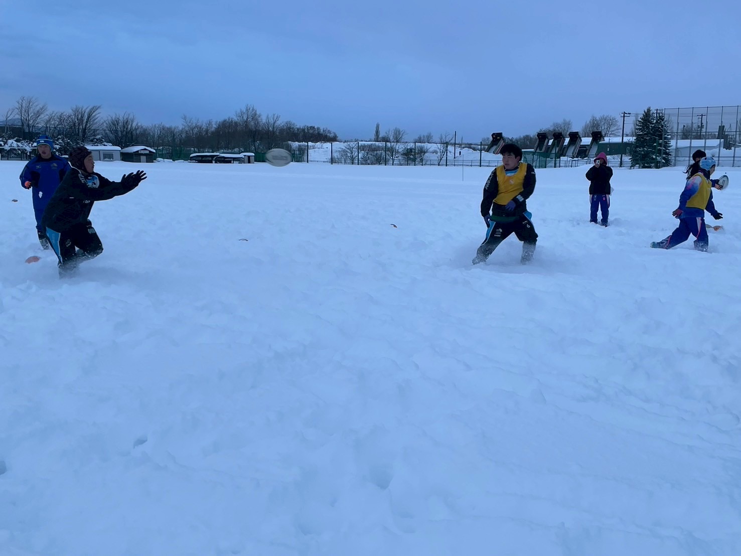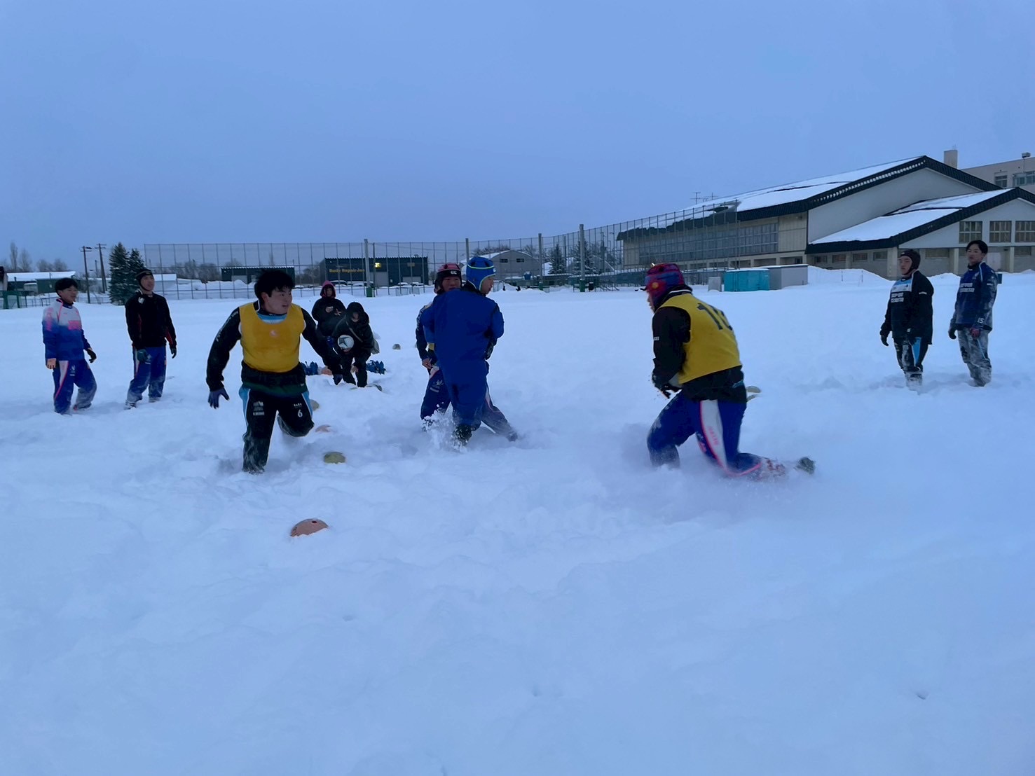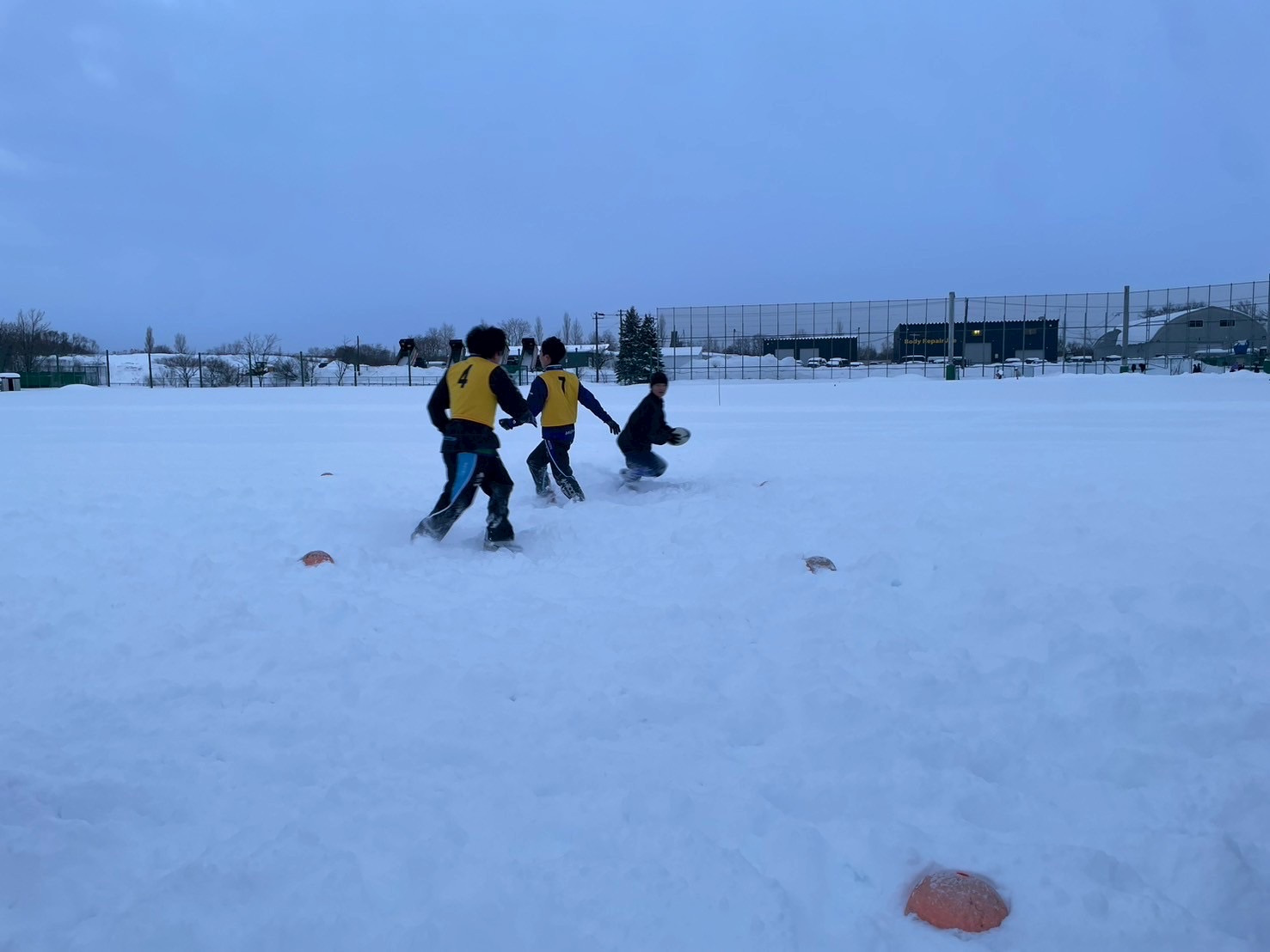 まず始めに、深い雪の中でタッチフットを行いました。ディフェンスに入る際のコミニュケーションをしっかりと取ることや周りの声にしっかりと聞く耳を持つことを意識して頑張りましょう。ゲームをしていない時はアドバイスをしながら大きな声を出す練習を行いました。日頃の練習から大きな声を出し、良い雰囲気作りに努めましょう。