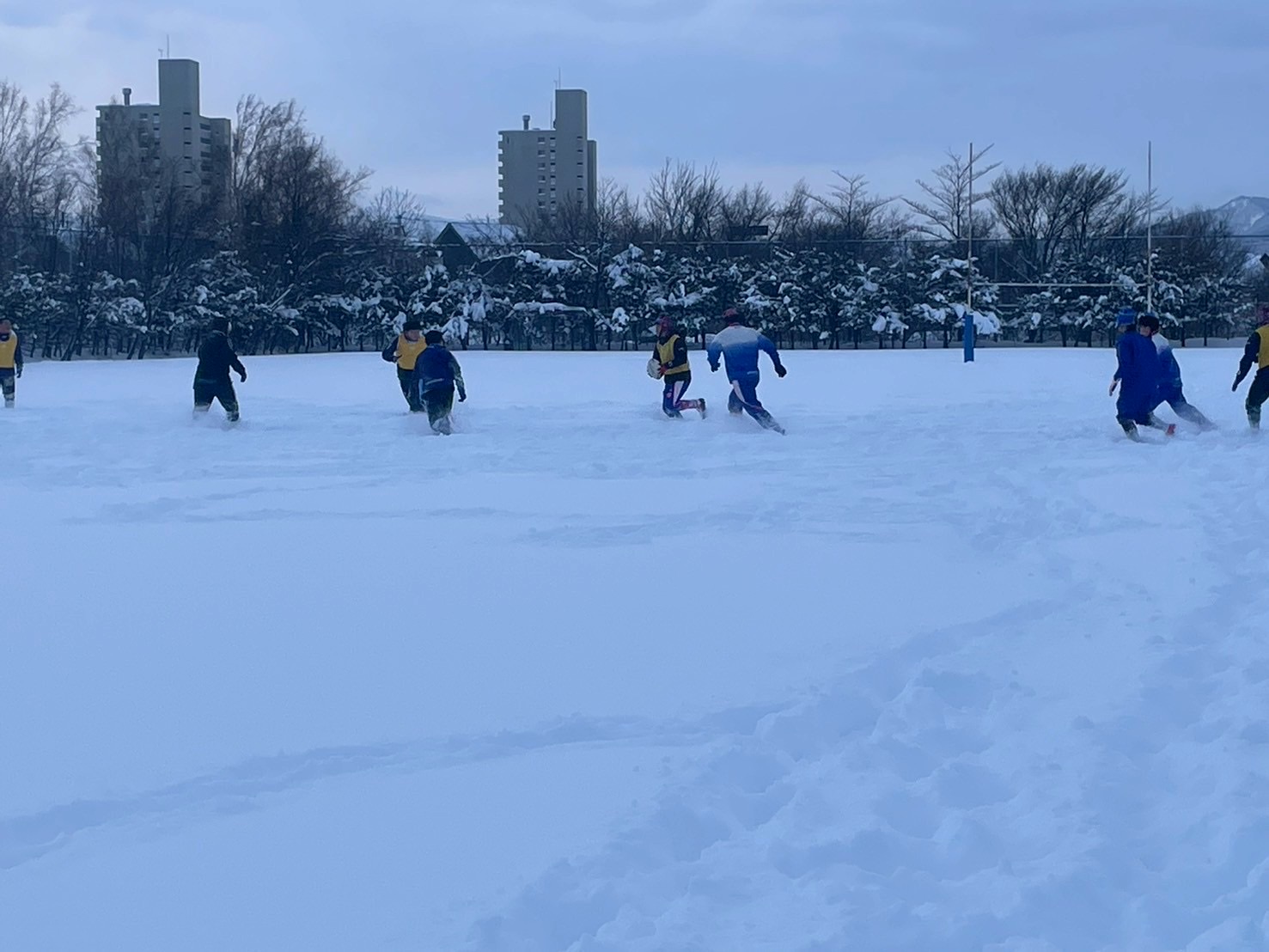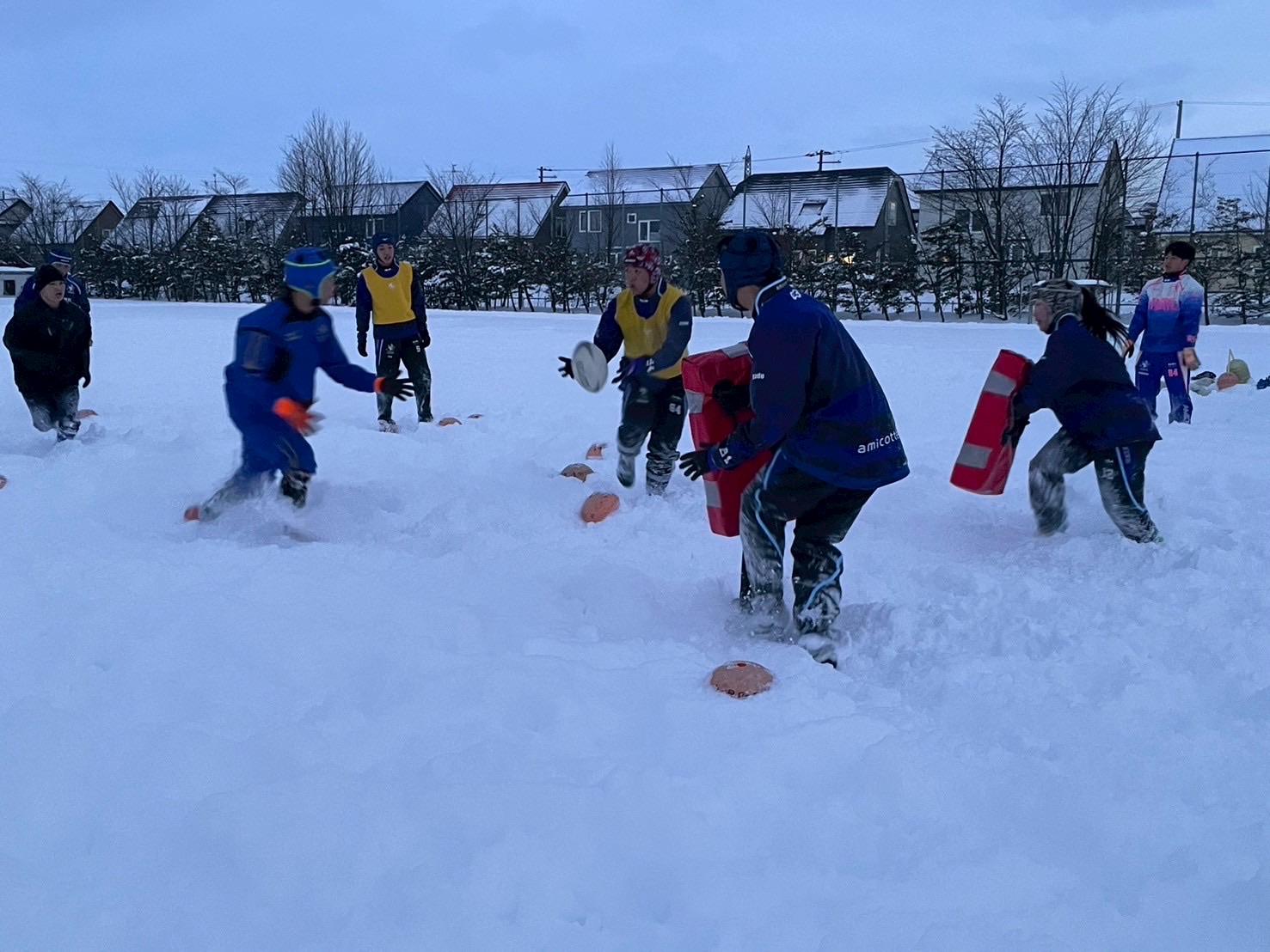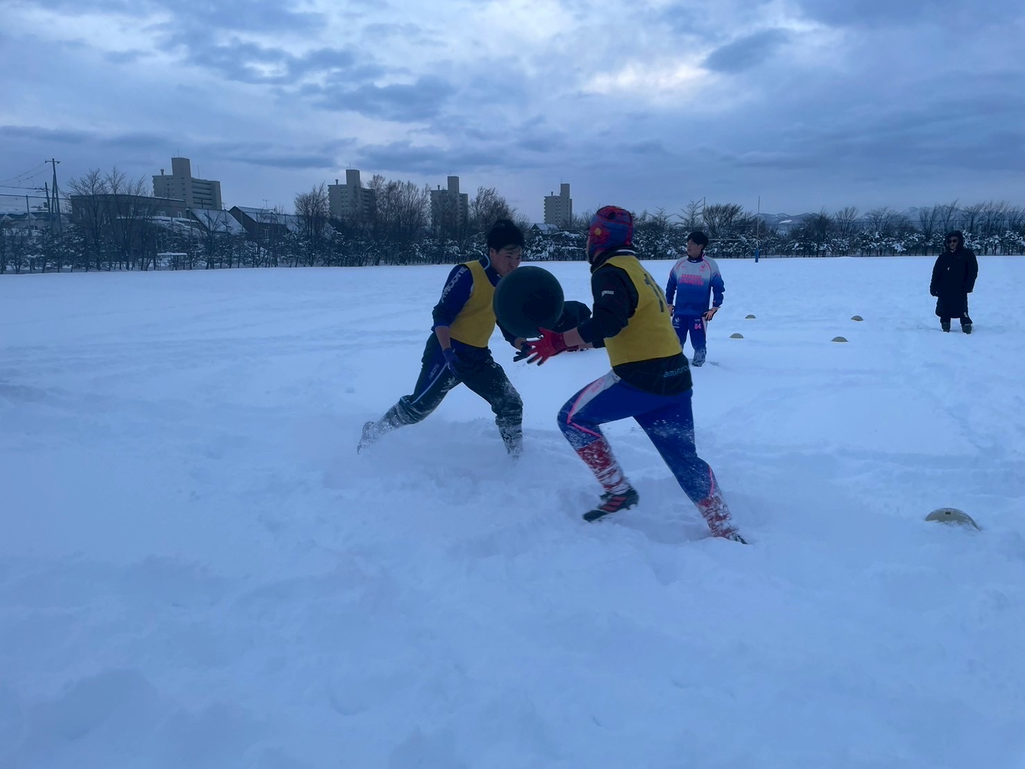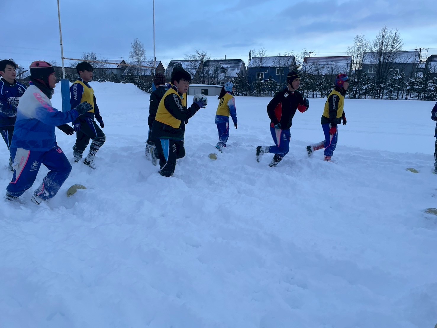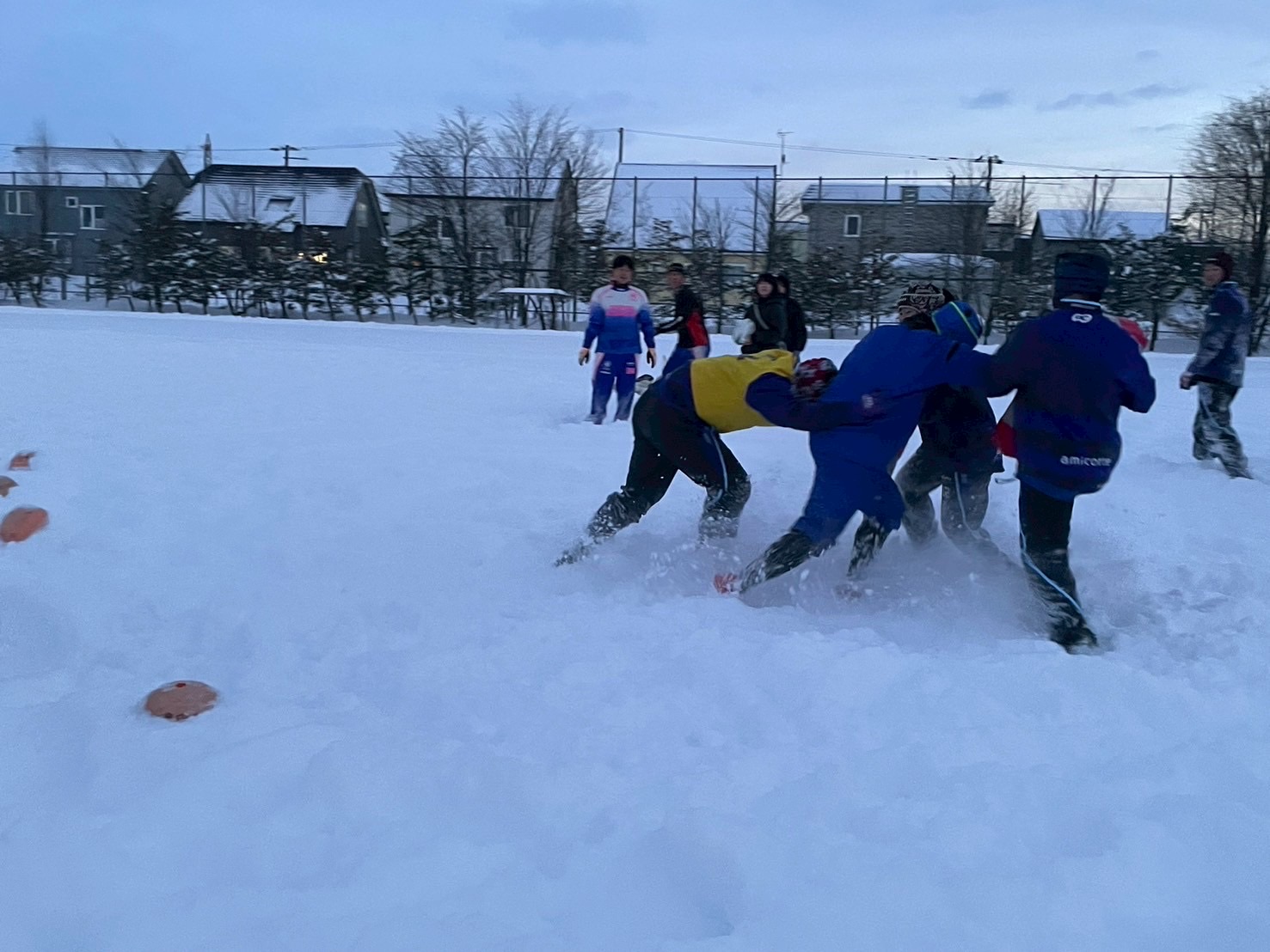 まず始めに、深い雪の中でタッチフットを行いました。ディフェンスに入る際のコミニュケーションをしっかりと取ることや周りの声にしっかりと聞く耳を持つことを意識して頑張りましょう。ゲームをしていない時はアドバイスをしながら大きな声を出す練習を行いました。日頃の練習から大きな声を出し、良い雰囲気作りに努めましょう。