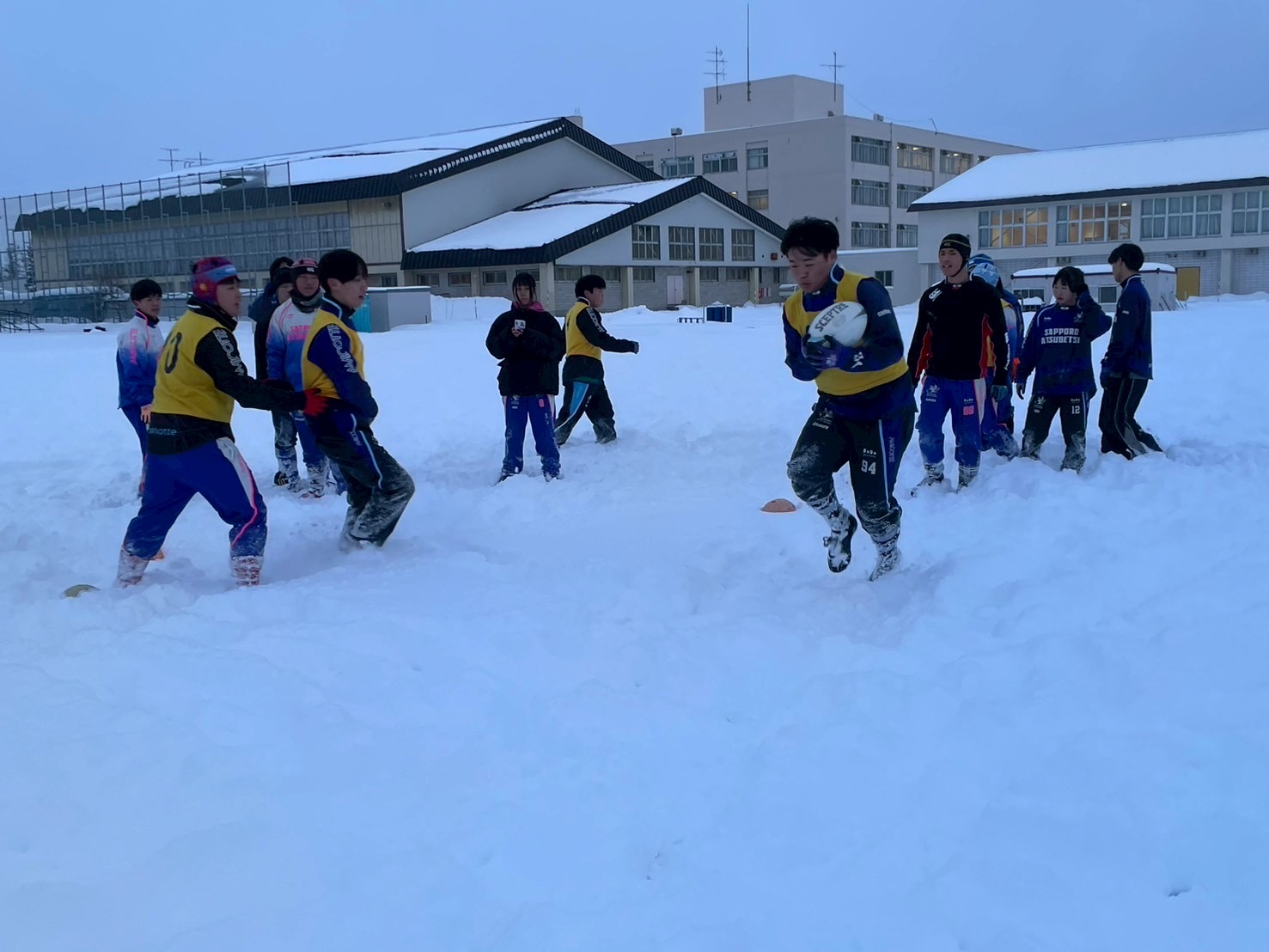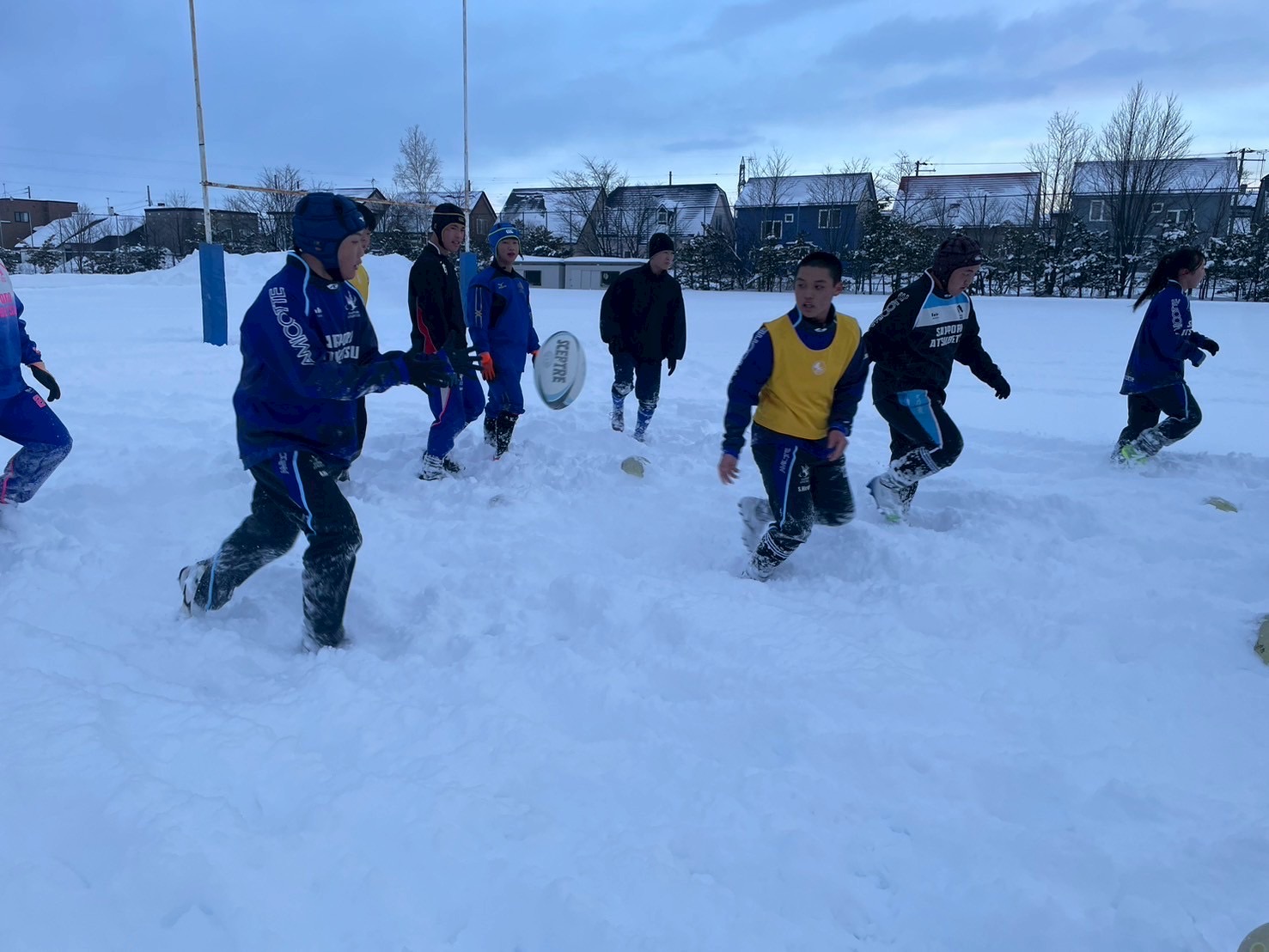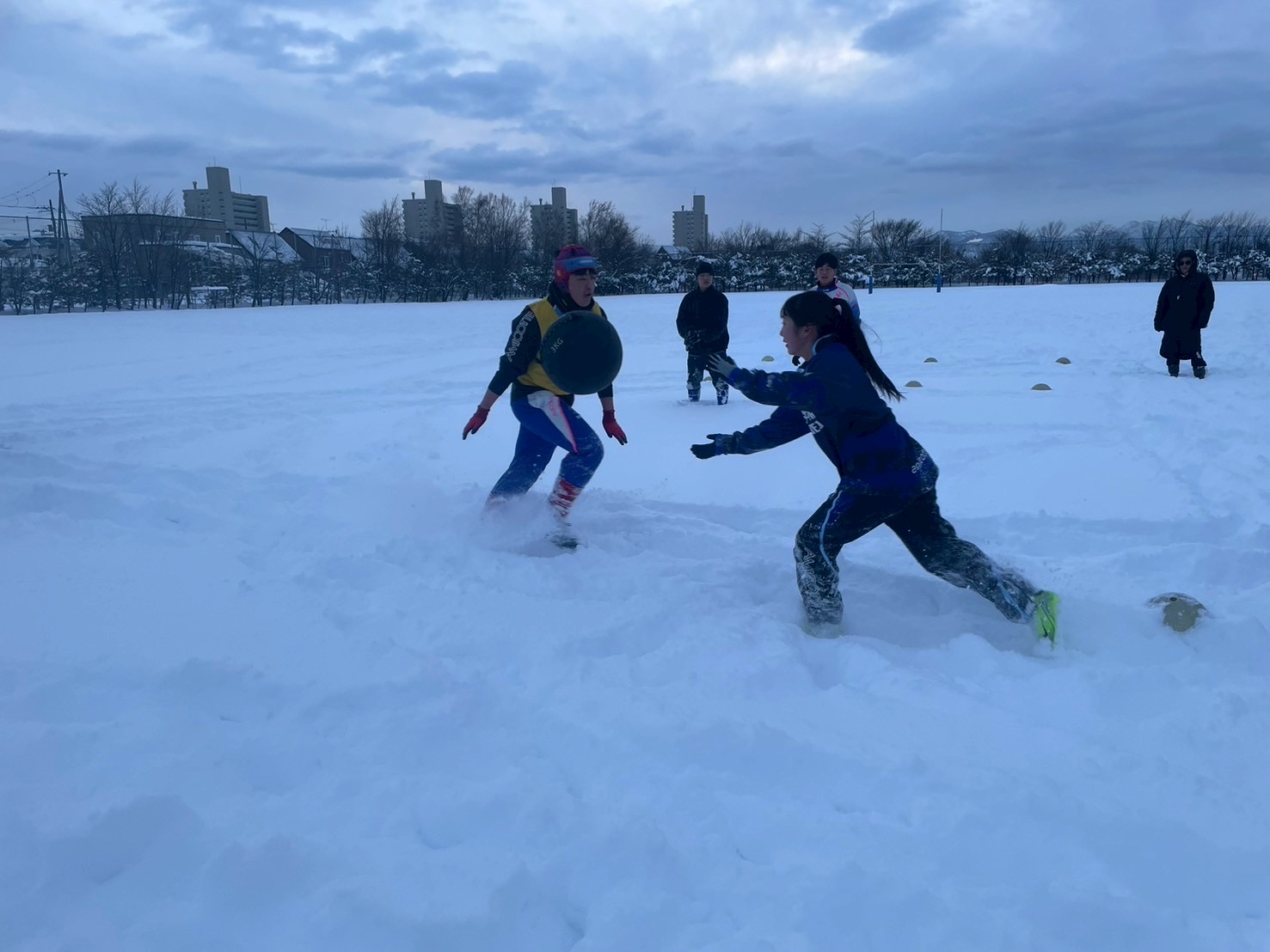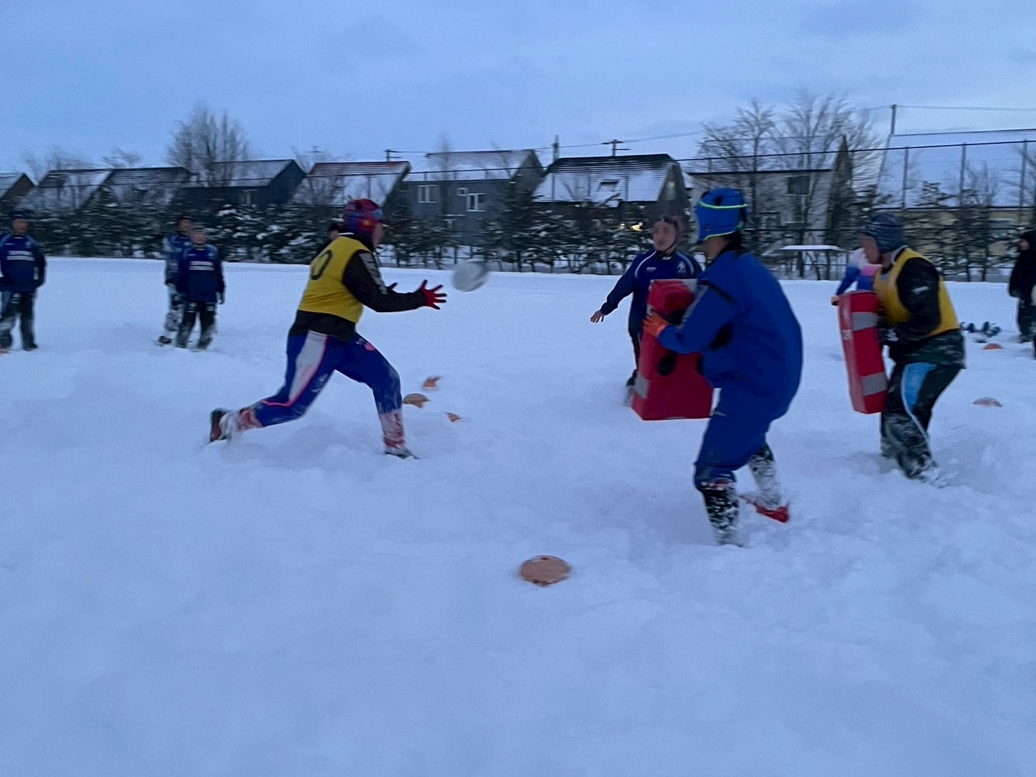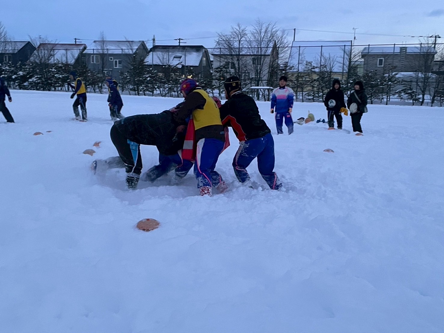 まず始めに、深い雪の中でタッチフットを行いました。ディフェンスに入る際のコミニュケーションをしっかりと取ることや周りの声にしっかりと聞く耳を持つことを意識して頑張りましょう。ゲームをしていない時はアドバイスをしながら大きな声を出す練習を行いました。日頃の練習から大きな声を出し、良い雰囲気作りに努めましょう。