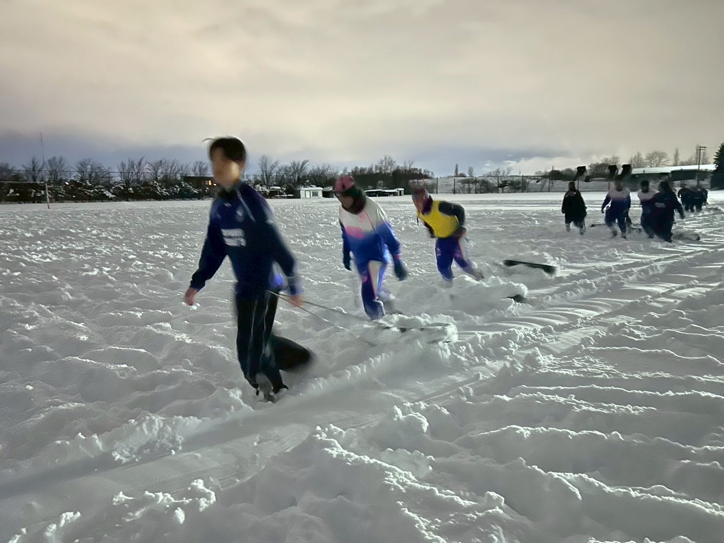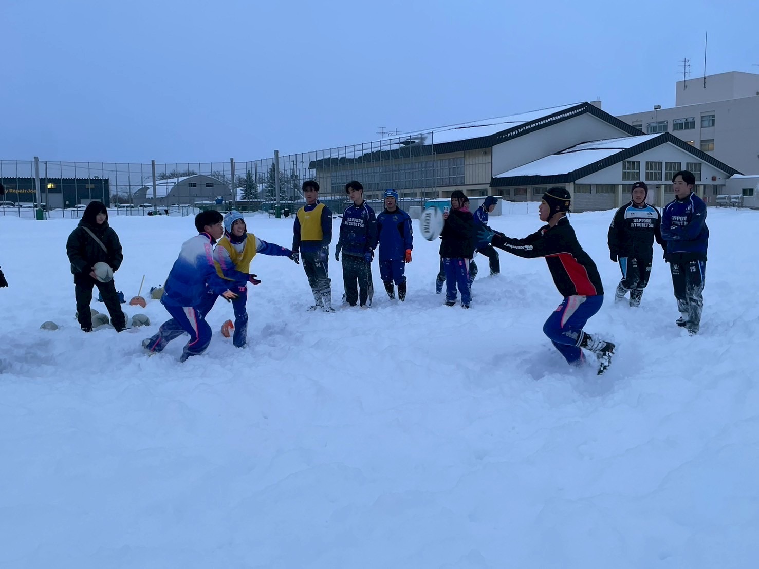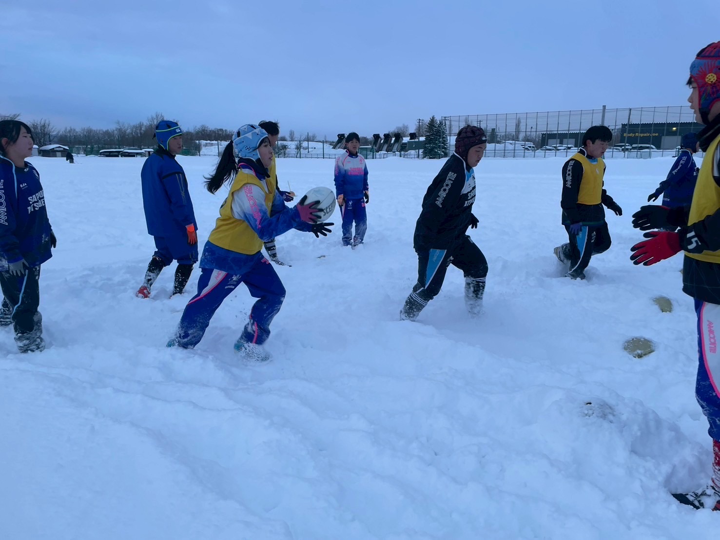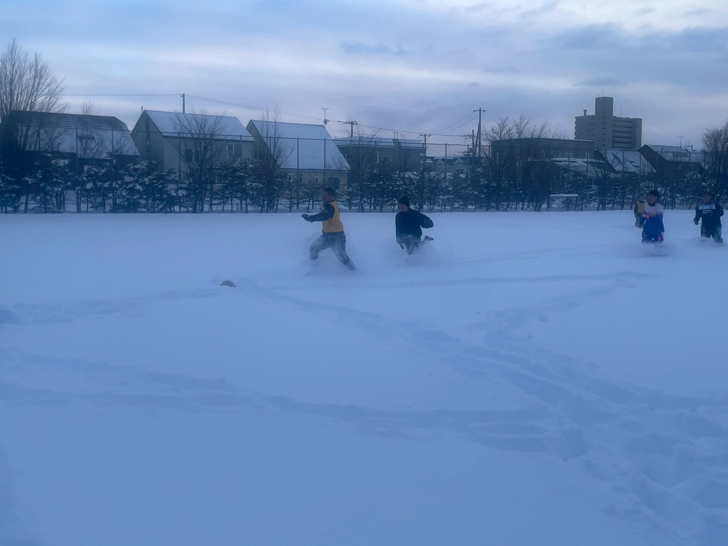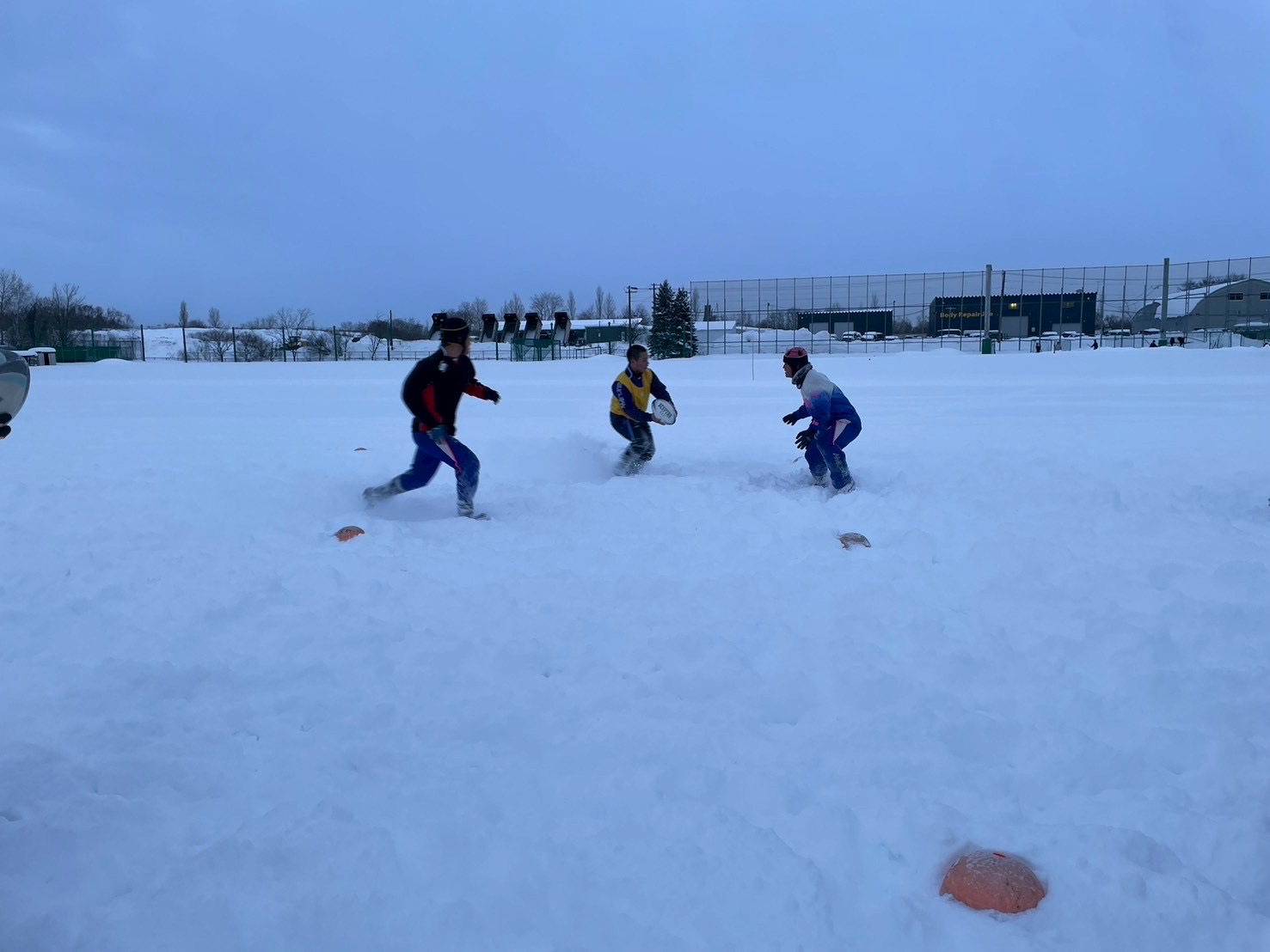 まず始めに、深い雪の中でタッチフットを行いました。ディフェンスに入る際のコミニュケーションをしっかりと取ることや周りの声にしっかりと聞く耳を持つことを意識して頑張りましょう。ゲームをしていない時はアドバイスをしながら大きな声を出す練習を行いました。日頃の練習から大きな声を出し、良い雰囲気作りに努めましょう。